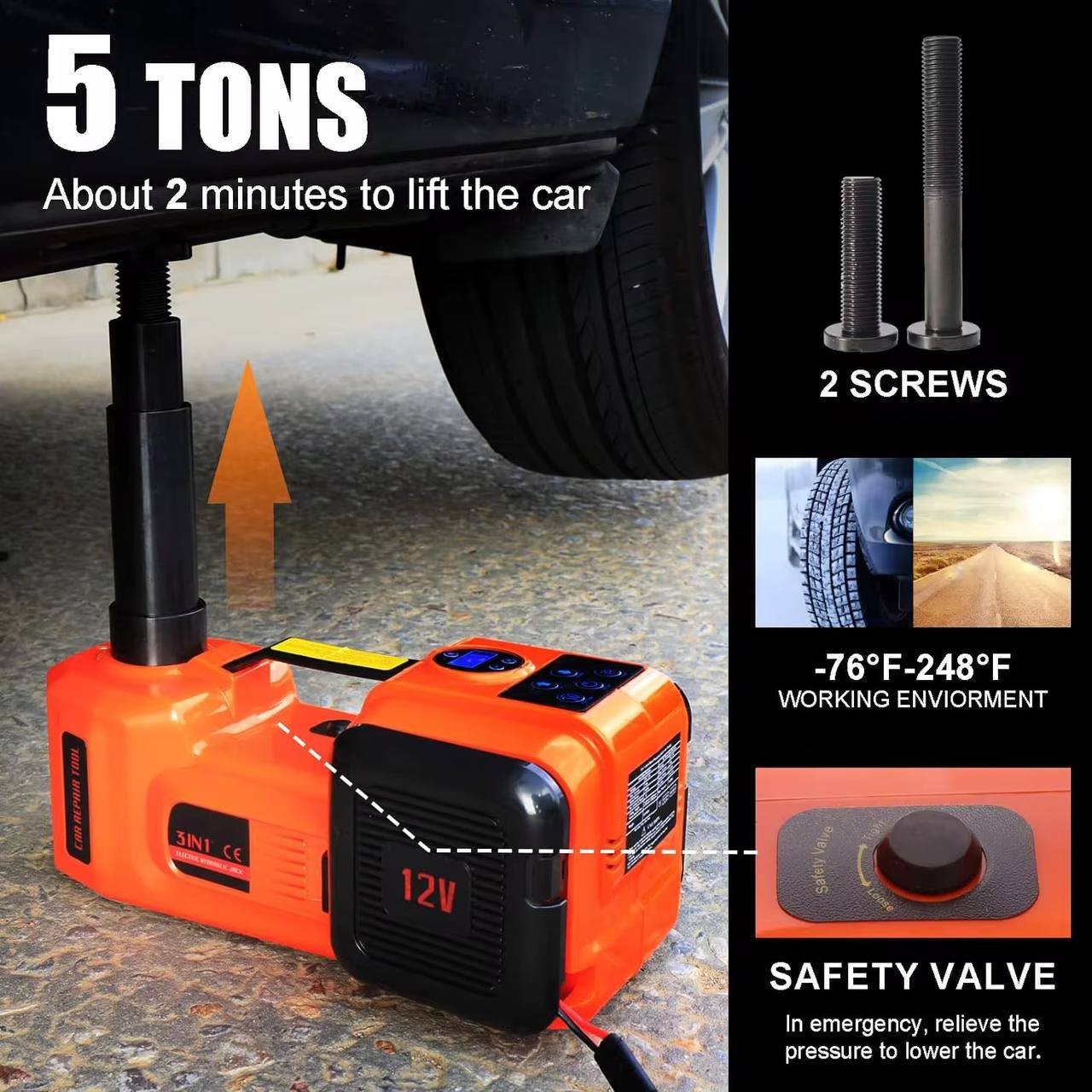 - 5 tonnes (5000 kg) : Ce cric est conçu pour lever des véhicules lourds tels que des SUV, des camions légers, et des voitures de grande taille. Il peut soulever une charge maximale de 5 tonnes en toute sécurité.