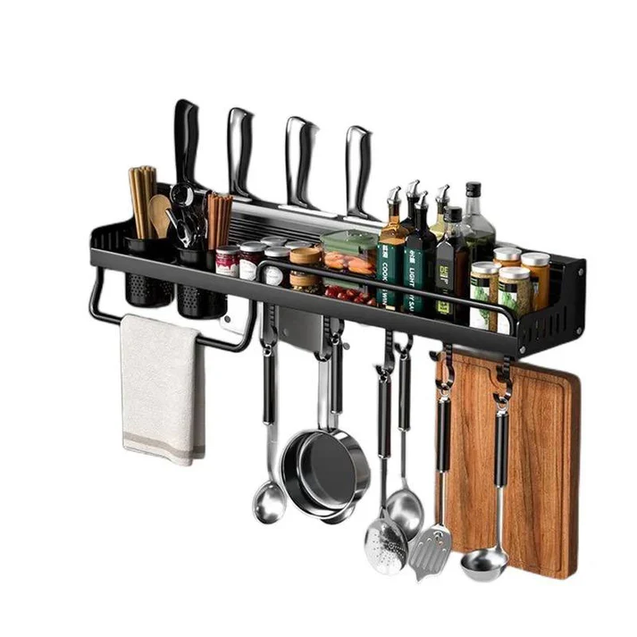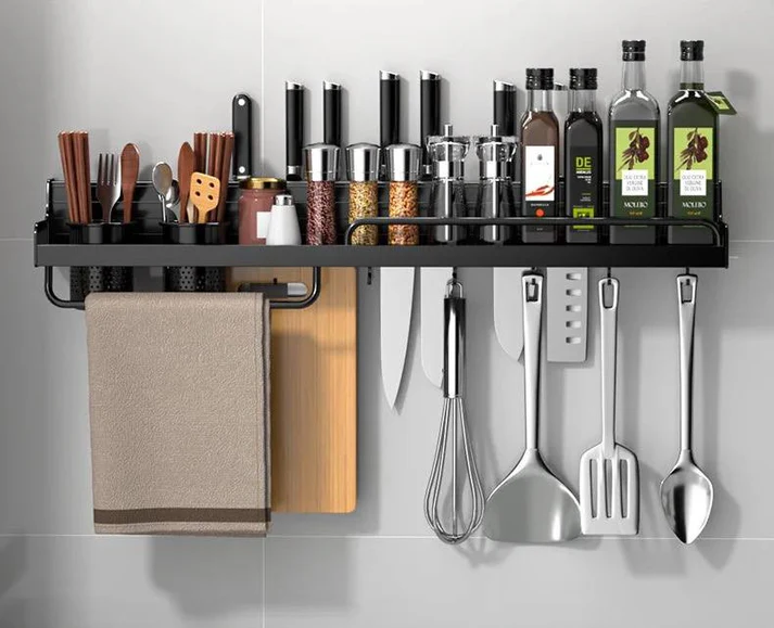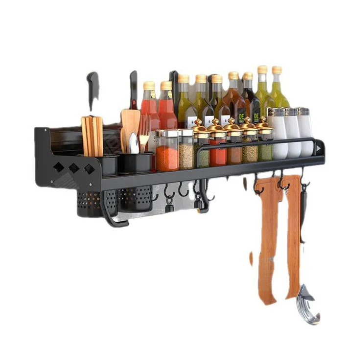 Polyvalence et Accessoires Inclus: L’étagère est livrée avec des accessoires pratiques pour répondre à tous vos besoins en cuisine. Elle comprend six crochets robustes pour suspendre vos ustensiles, une tige spécialement conçue pour accrocher vos torchons, et un verre perforé idéal pour ranger vos couverts ou vos couteaux. Vous pouvez également y placer vos épices, condiments, ou autres accessoires de cuisine, tout en les gardant parfaitement organisés.