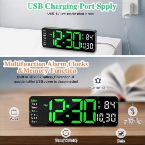 - Affichage Polyvalent : Au-delà de l’heure, l’horloge offre un affichage polyvalent comprenant la température ambiante, la date, et le jour de la semaine, vous tenant informé en temps réel de tous les paramètres essentiels de votre quotidien.
